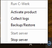 The C-Werk Tray Tool provides quick access to the C-Werk Client application, activation utilities, and options for collecting system information, performing backups, restoring configurations, and restarting the Server.