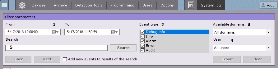 To search for system log events, you need to set one or more filters: