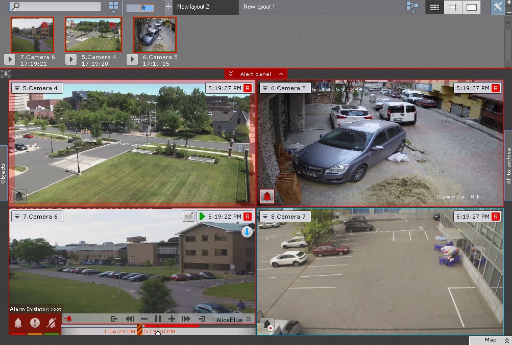 Alarms Panel displays video footage for all alerts / detection events in individual Event Preview tiles.