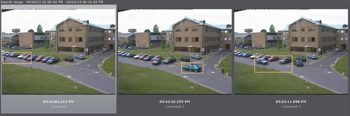 This starts a search for video fragments based on the defined criteria. The search results pane displays frames for which there are comments containing the search text. The relevant comment is displayed under each frame.