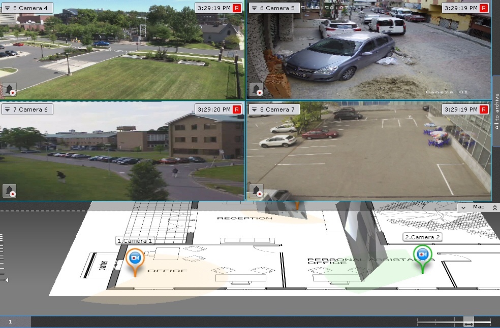 El paso al modo de visualización del mapa se realiza desde todos los modos de videovigilancia, a excepción del modo de análisis del archivo.