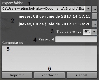 Se abrirá la ventana de exportación. - Si fuera necesario, modifique la ruta de exportación (1). Por defecto, el archivo se exportará a la carpeta especificada en la configuración (véase la sección Configuración de los parámetros de exportación).