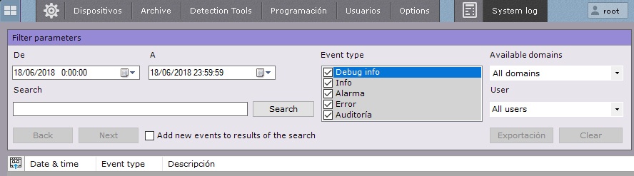 Como resultado de la ejecución de la operación se mostrará la ventana destinada a la búsqueda, presentación y exportación de eventos del historial de sistema.