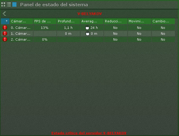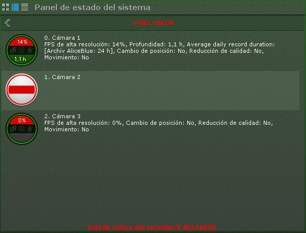 - Crítico - no hay señal desde la videocámara o la velocidad de flujo es menor de 20%. El color de la videocámara en el diagrama y en la tabla es rojo.