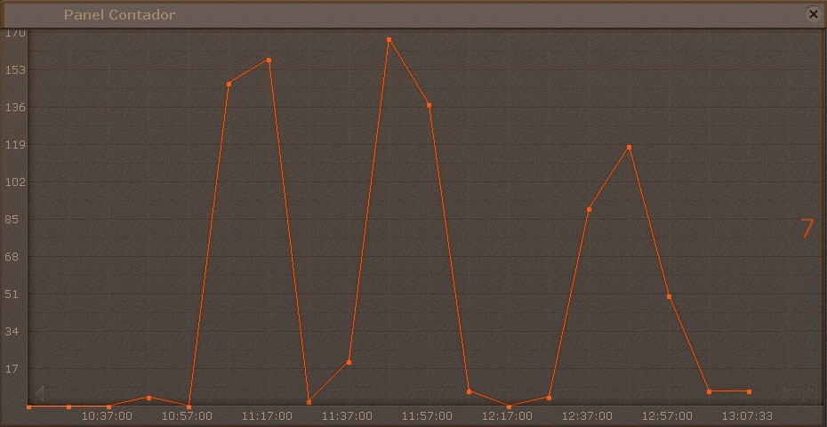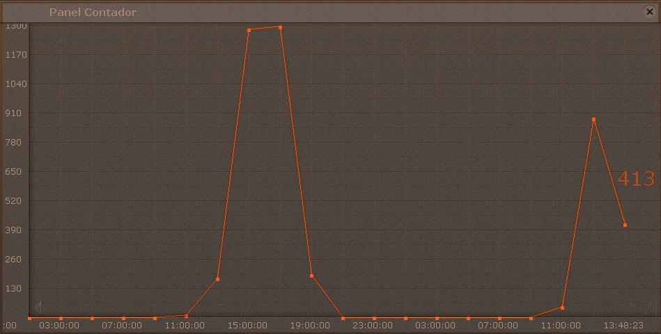 Por ejemplo, para este gráfico con período de 2 horas y hora actual 13:48:23 el valor actual de la cantidad de eventos calculado para el periodo de11:48:00 a 13:48:00 es igual a 413.