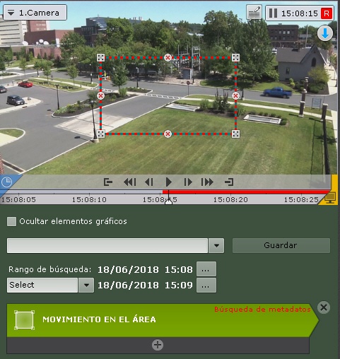 Existe la posibilidad de ocultar los elementos gráficos de la ventana de videovigilancia, si es que éstos molestan durante la redacción de los elementos visuales. Para esto será necesario poner el marcador Ocultar elementos gráficos debajo de la ventana de búsqueda.