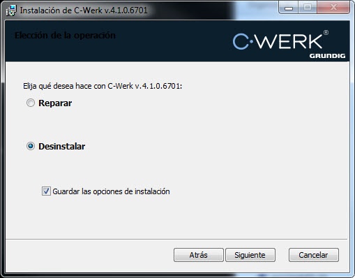 El programa de instalación de C-Werk funciona también en el modo de desinstalación. Este modo se utilizará cuando sea necesario eliminar todos los componentes de la aplicación software C-Werk de su ordenador.