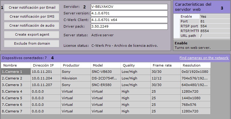 4. Lista de videocámaras conectadas al Servidor, con los parámetros básicos (4).
