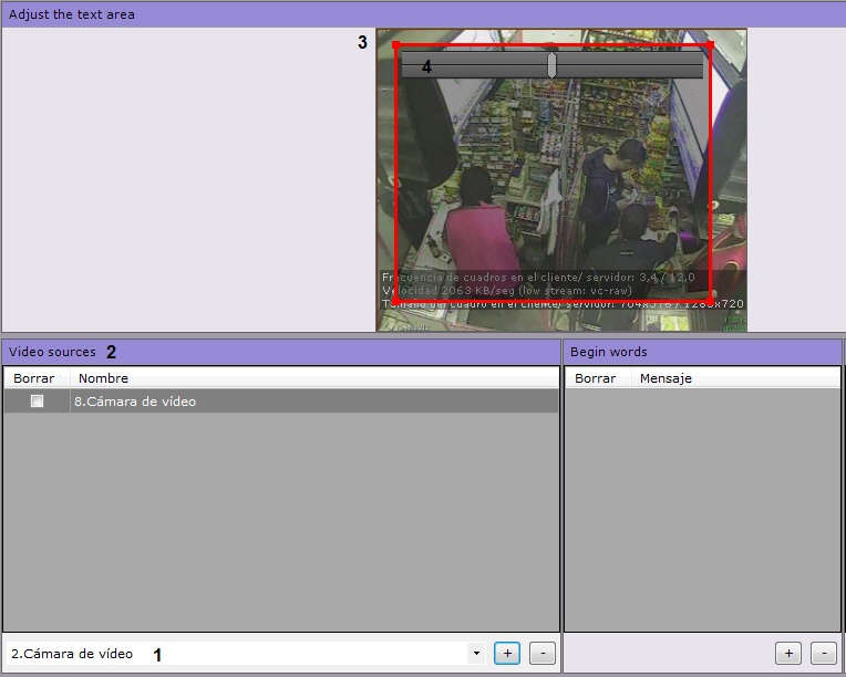 - Seleccione una videocámara en el grupo Video sources (2). En el grupo Adjust the text area se mostrará la imagen de la videocámara del caso y se configurará la zona de presentación de los títulos (3).