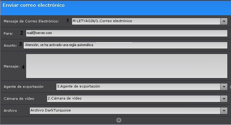 Esta acción envía un mensaje por e-mail a la dirección establecida, se puede añadir vídeos o imágenes exportados.
