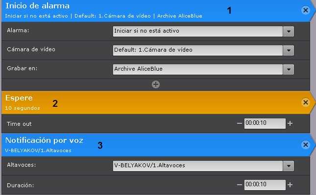 Por ejemplo, al ejecutar esta macro primero se iniciará la alarma en el sistema (1), y luego, después de 10 segundos (2), se reproducirá una alerta sonora (3).