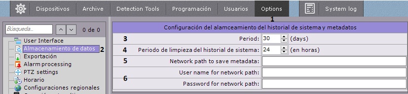 2. En el campo Periodo ingrese en días el tiempo de almacenamiento del historial de sistema y metadatos en la base de datos de trayectorias de los objetos (3)Si ingresa el valor 0, no habrá limitaciones para el almacenamiento de datos. El valor máximo permisible es de 1000 días.
