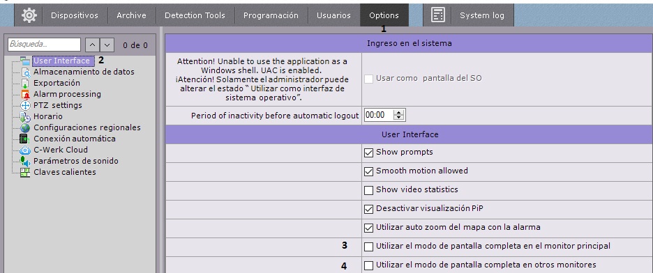 1. Seleccionar el submenú Configuración ->Opciones ->Interfaz de usuario (1-2).