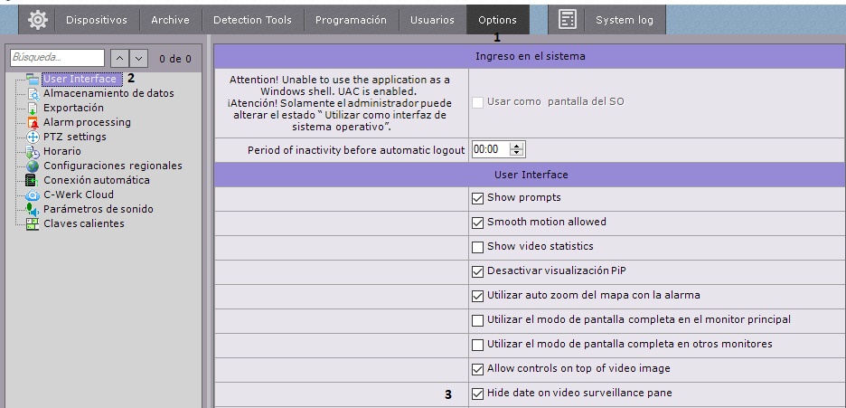 1. Elija el submenú Configuración   Opciones   Interfaz de Usuario (1-2).