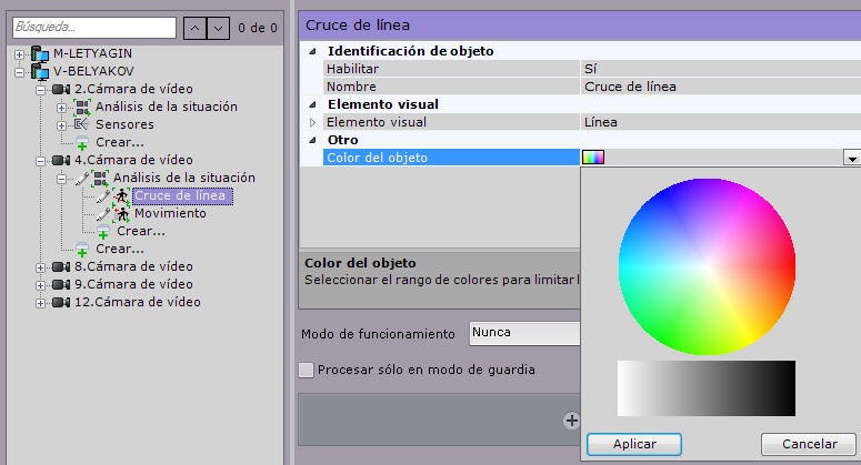 - Seleccione la herramienta de detección correspondiente al objeto y haga clic en en el campo Color del objeto. Se abrirá el diálogo para asignar el color del objeto.
