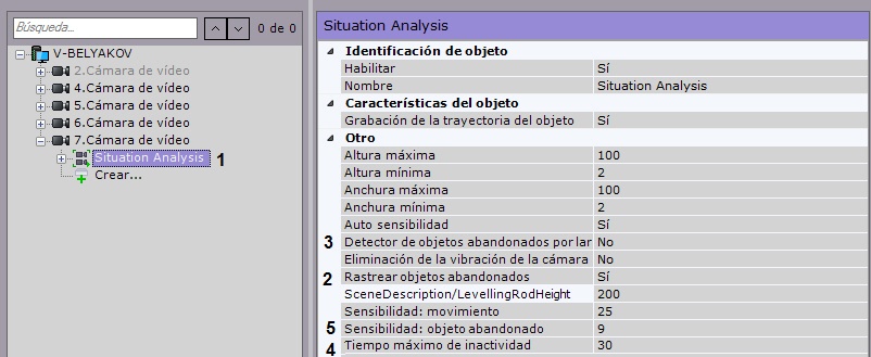 5. En el campo Sensibilidad a objetos abandonados (4) ingresar la sensibilidad de los detectores de análisis de situación a objetos abandonados en el diapasón [5, 30].