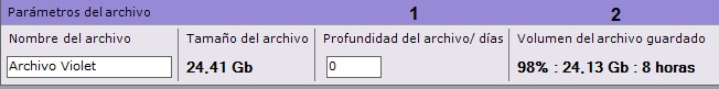 En el campo Volumen del archivo grabado se muestra el volumen del archivo ocupado, expresado en porcentaje (2).