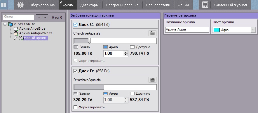 На базе одного Сервера можно создать неограниченное количество архивов. Архив может быть размещен как на локальных дисках, так и на сетевых.