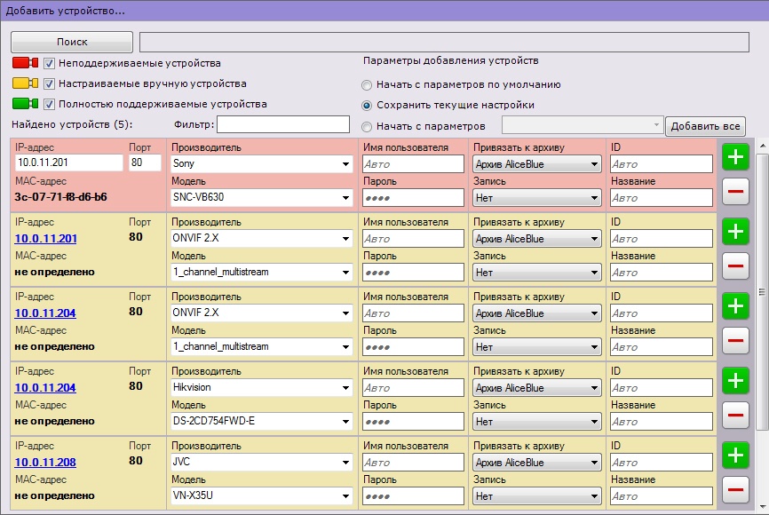 Для добавления одного устройства следует нажать кнопку , для добавления всех - кнопку Добавить все.