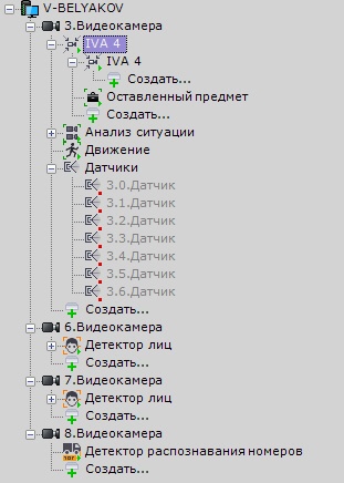 Для создания детектора необходимо нажать ссылку Создать в ветке соответствующей видеокамеры и выбрать необходимый детектор.
