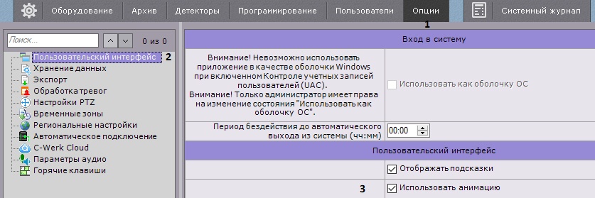 Анимация необходима для плавного изменения положения Окон видеонаблюдения, а также для плавного переключения между закладками. По умолчанию анимация Окон видеонаблюдения включена. Для ее отключения необходимо выполнить следующие действия: