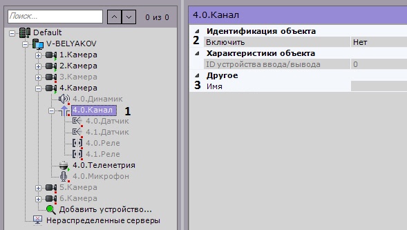 Объект Канал отображается в дереве объектов дочерним по отношению к видеокамере, если видеокамера имеет встроенный или подключаемый дискретный вход (Объект Датчик) или выход (Объект Реле).