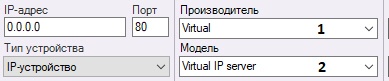 2. В форме ручного добавления IP-устройства выбрать Virtual в поле Производитель (1).