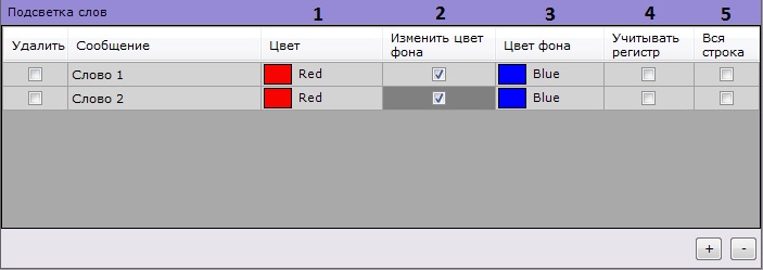 1. В группе Подсветка слов добавить (кнопка +) одно или несколько слов (количество не ограничено), которые необходимо выделять. Редактирование слова осуществляется после двойного клика по нему.