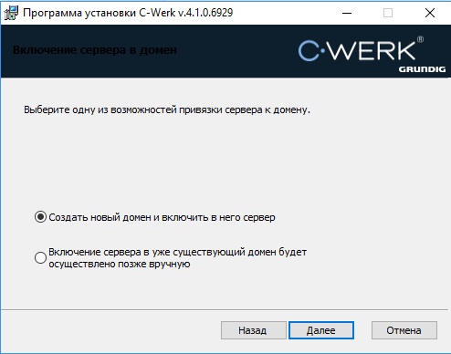 1. Выбор Сервера, на базе которого следует создать новый C-Werk-домен. Установка на нём ПК C-Werk с типом конфигурации Сервер и Клиент с использование C-Werk-домена со стандартным именем Default (см. также шаг 8 инструкции в разделе Установка).