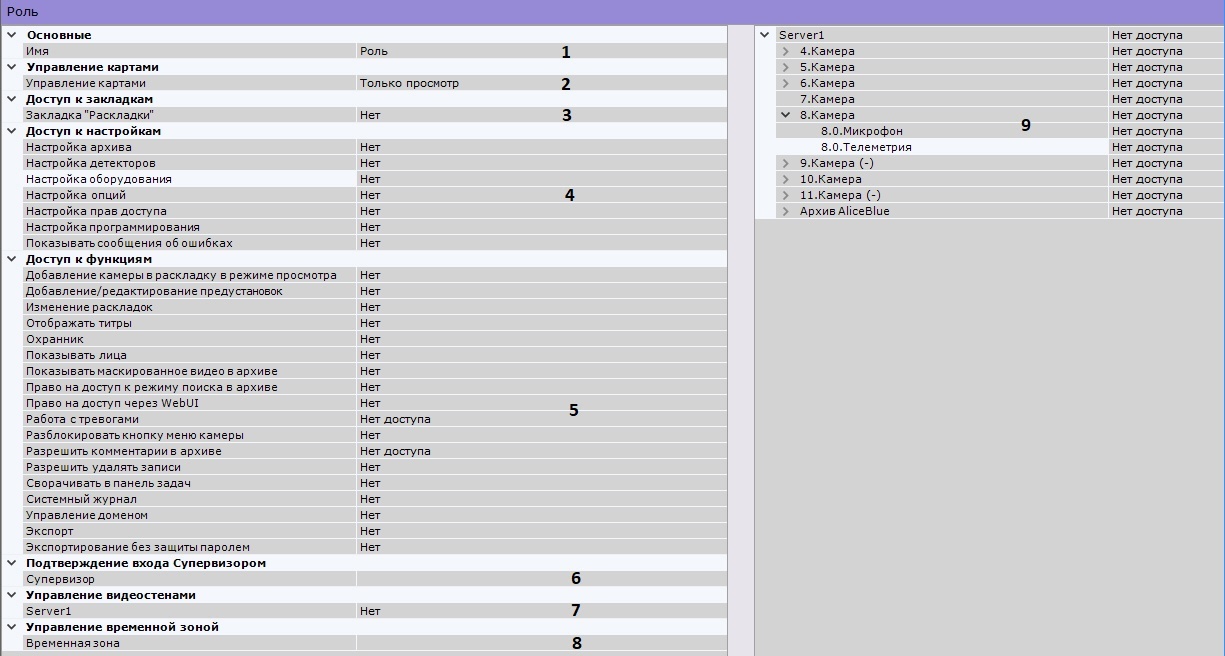 устанавливаются вручнуюНет доступа - Нет доступа к оборудованию и архивам Реальное время под охраной Видеокамера Просмотр на охране Микрофон Живой звук Телеметрия Средний уровень Архив Нет доступа Реальное время Видеокамера Просмотр живого видео Микрофон Живой звук Телеметрия Средний уровень Архив Нет доступа Реальное время/Архив Видеокамера Просмотр живого видео и архива Микрофон Живой звук и архив Телеметрия Средний уровень Архив Полный доступ Реальное время/Архив/Управление Видеокамера Все функции, конфигурирование недоступно Микрофон Живой звук и архив Телеметрия Средний уровень Архив Полный доступ Реальное время/Архив/Управление/Настройка Видеокамера Все функции + конфигурирование Микрофон Живой звук и архив Телеметрия Максимальный уровень Архив Полный доступ - Нажать кнопку Применить для сохранения роли.