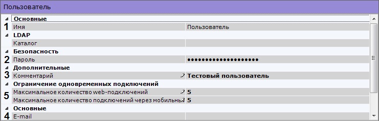 5. Если требуется ограничить количество подключений под данным пользователем через web- или мобильные Клиенты, необходимо задать допустимое количество подключений (5).