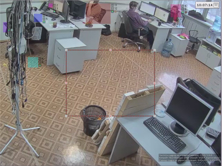 При этом в окне видеонаблюдения отображаются параметры (ширина, высота в процентах от ширины или высоты кадра и цвет) объектов трекинга.