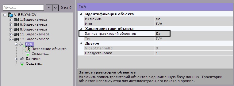 Для получения метаданных от системы Bosch IVA необходимо создать объект IVA и выбрать значение Да в списке Запись траекторий объектов.