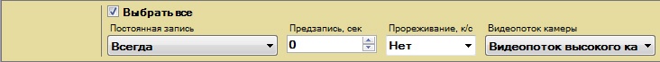 1. Установить флажки рядом с видеокамерами, для которых необходимо настроить запись в архив. Для выбора всех видеокамер установить флажок Выбрать все.