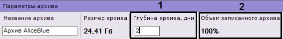 В поле Объем записанного архива отображается объем заполнения архива в процентах, гигабайтах и часах (2).