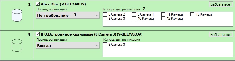 2. Выбрать один или несколько архивов, из которых необходимо копировать данные (1). Репликацию также можно осуществлять из встроенного хранилища видеокамеры (4, см. Объект Встроенное хранилище).