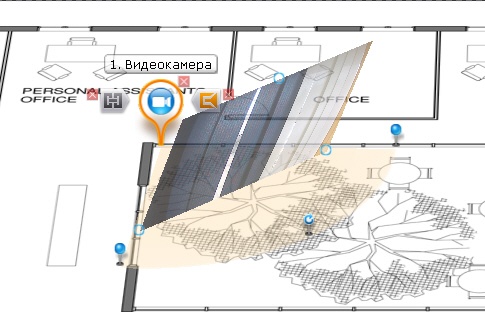 На карте могут располагаться значки видеокамер, реле и датчиков. Для каждой видеокамеры отображается сектор её обзора и область, в котором отображается видеоизображение в реальном времени.