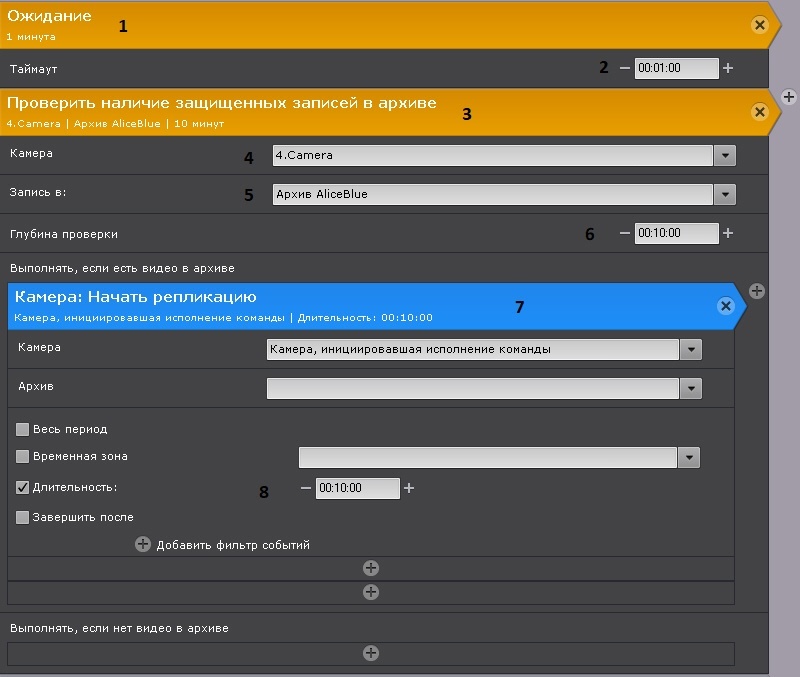 4. В качестве действия, которое необходимо выполнять при наличии защищенных видеозаписей в интервале проверки, добавить репликацию данных (7, см. Начать репликацию).