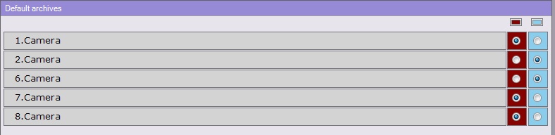 The Default archives form displays a list of cameras and archives, which are marked with the corresponding colors. If archive recording to at least one archive is enabled for a particular camera, the camera is visually marked as related to its default archive. - To change the default archive for a camera, move the designator to the relevant archive.