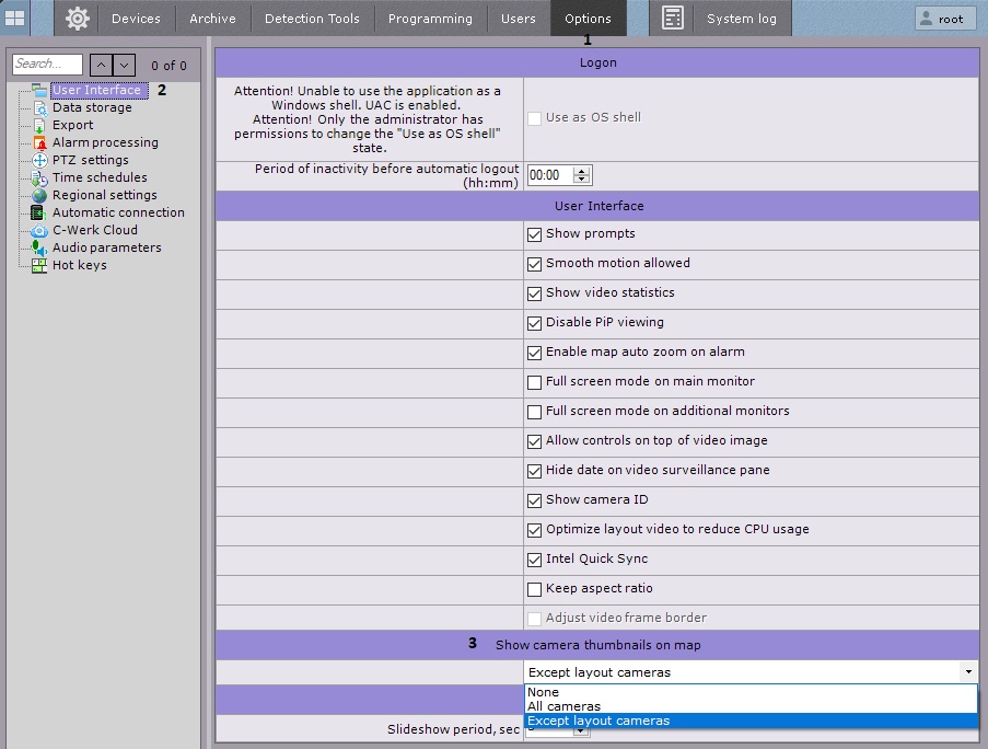 By default, the map shows video (see Configuring a camera in standard map viewing mode) only from cameras that are not on the current layout.