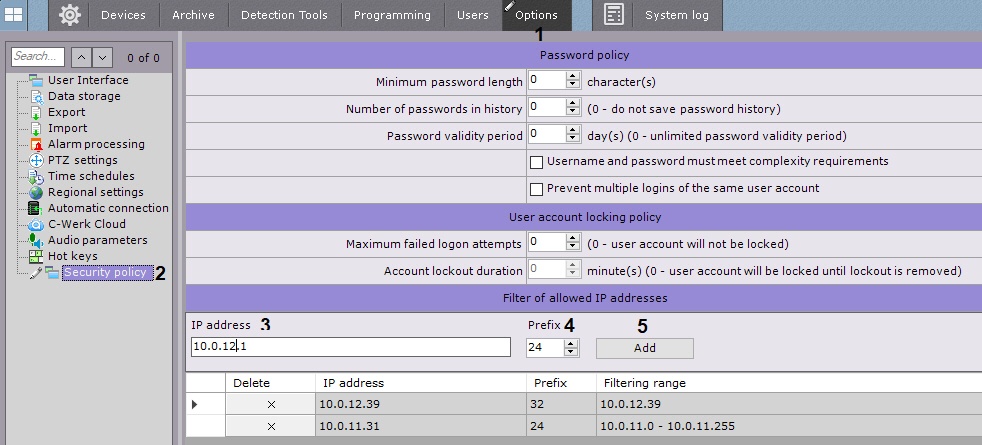 - Select Settings -> Options -> Security Policy (1-2).