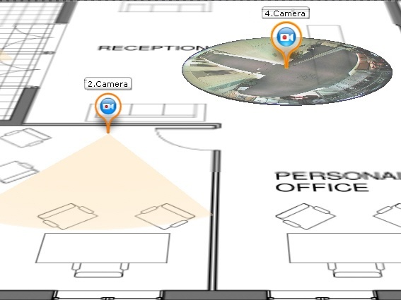 If a fisheye camera is ceiling-mounted (this position is selected in the video camera settings, see Configuring fisheye cameras) and a 360о field of view is specified for it on the map, the video from the camera is displayed on the map in real time.