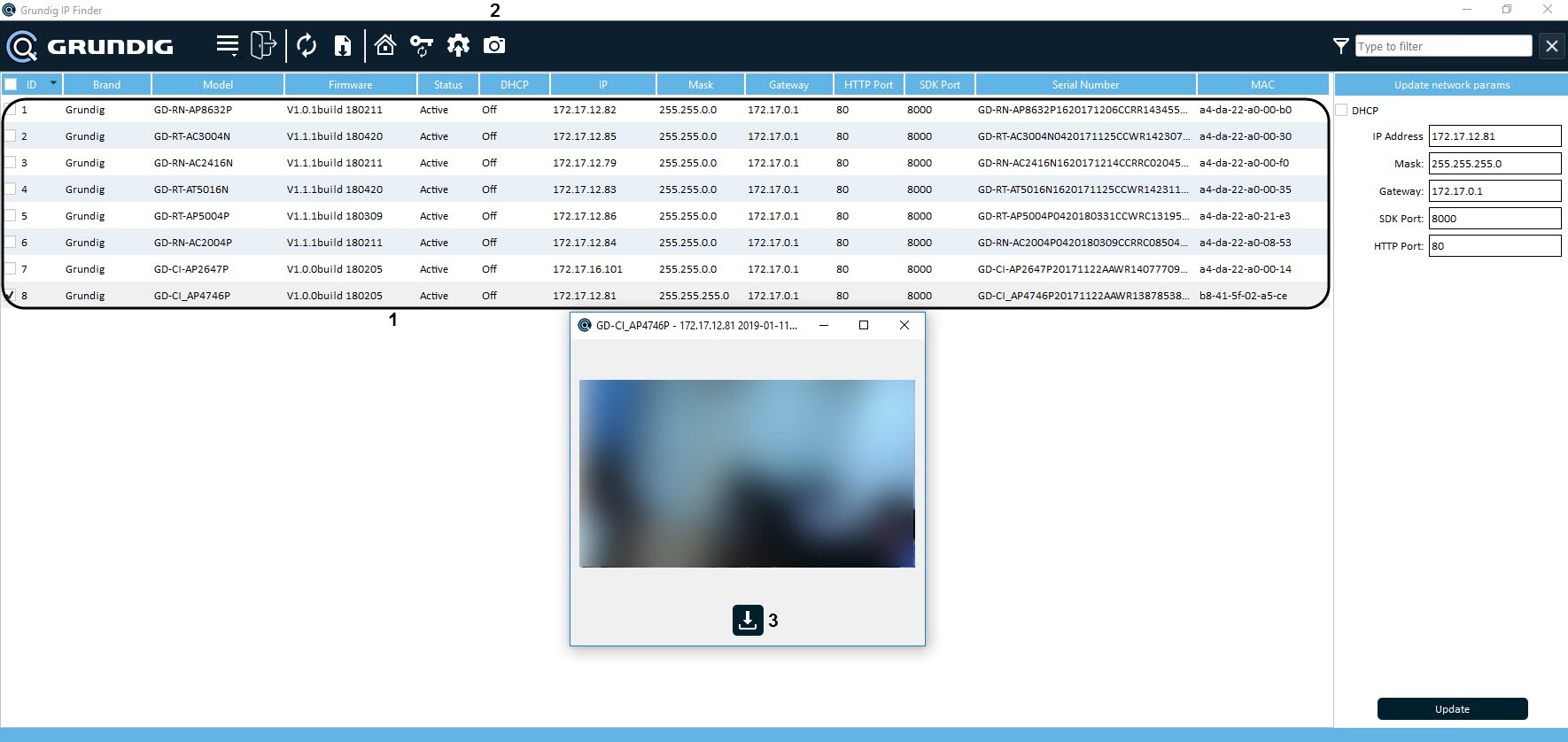 - Select the desired camera from the list (1).