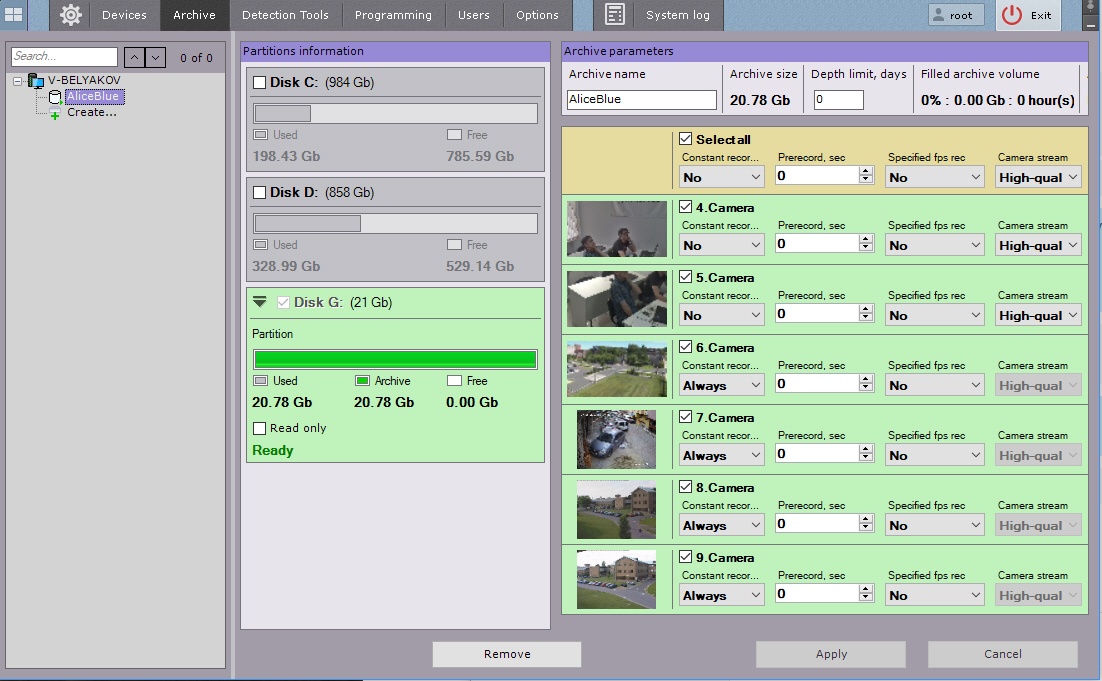 Configure the archive as follows: select the archive type, configure archive volumes, click the Apply button.