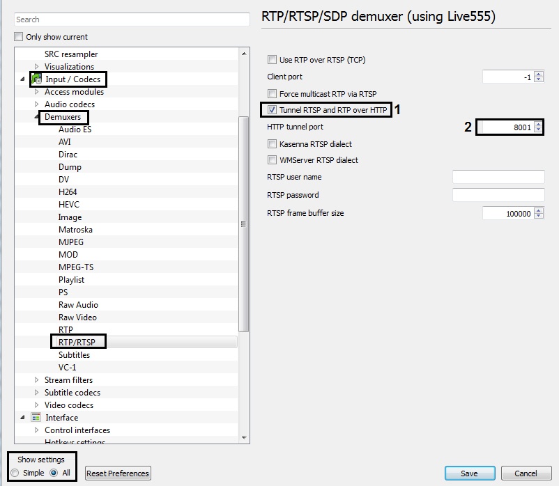 To configure tunneling in VLC set the Tunnel RTSP and RTP over HTTP checkbox (1) checked and the web-server port (2, see Configuring the web server).