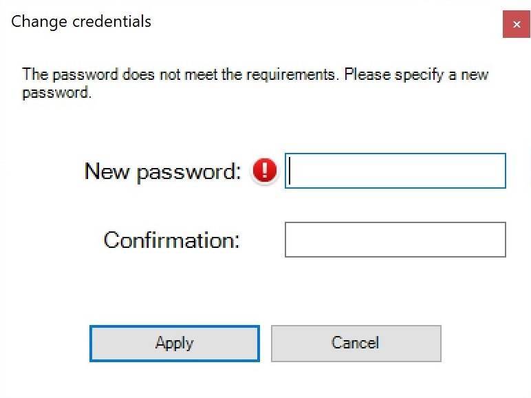 When you hover the cursor over the  icon, a tooltip will appear in which you can see the requirements for the new password (see Configuring the user security policy). Click the Apply button to save the new password.