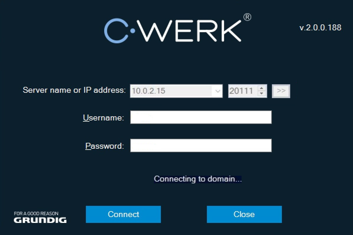 For example: C:\Program Files\Grundig\C-Werk\bin>C-Werk.exe --login=root --password=root --server=10.0.11.30, 10.0.11.34