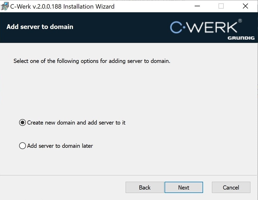 1. Selecting a Server on the basis of which the new Domain will be created. Installing the C-Werk software package with the Server and Client configuration type, indicating the name of the new Domain (see also step 8 of the instructions in the section Installation).