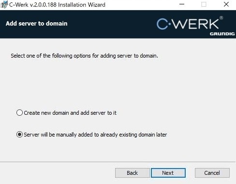 2. Installing the C-Werk software package with the Server and Client configuration type on the other servers of the future Domain, without adding them to the Domain (see also step 8 of the instructions in the section Installation).