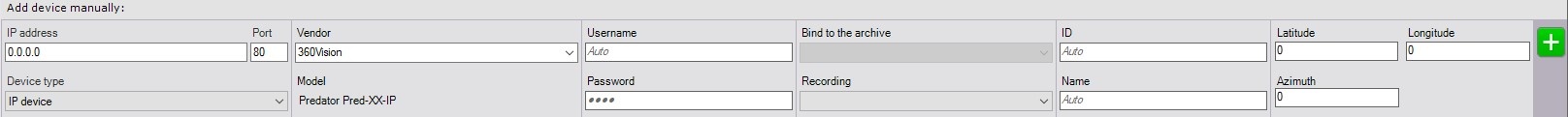 IP address, Port, Vendor, Model, Login, Password, Identifier, Object name, Latitude, Longitude, Azimuth, Archive name, Recording mode